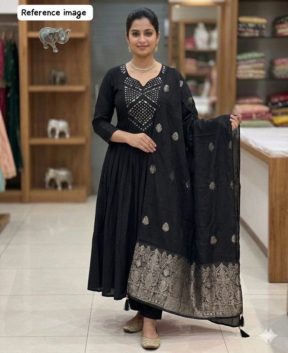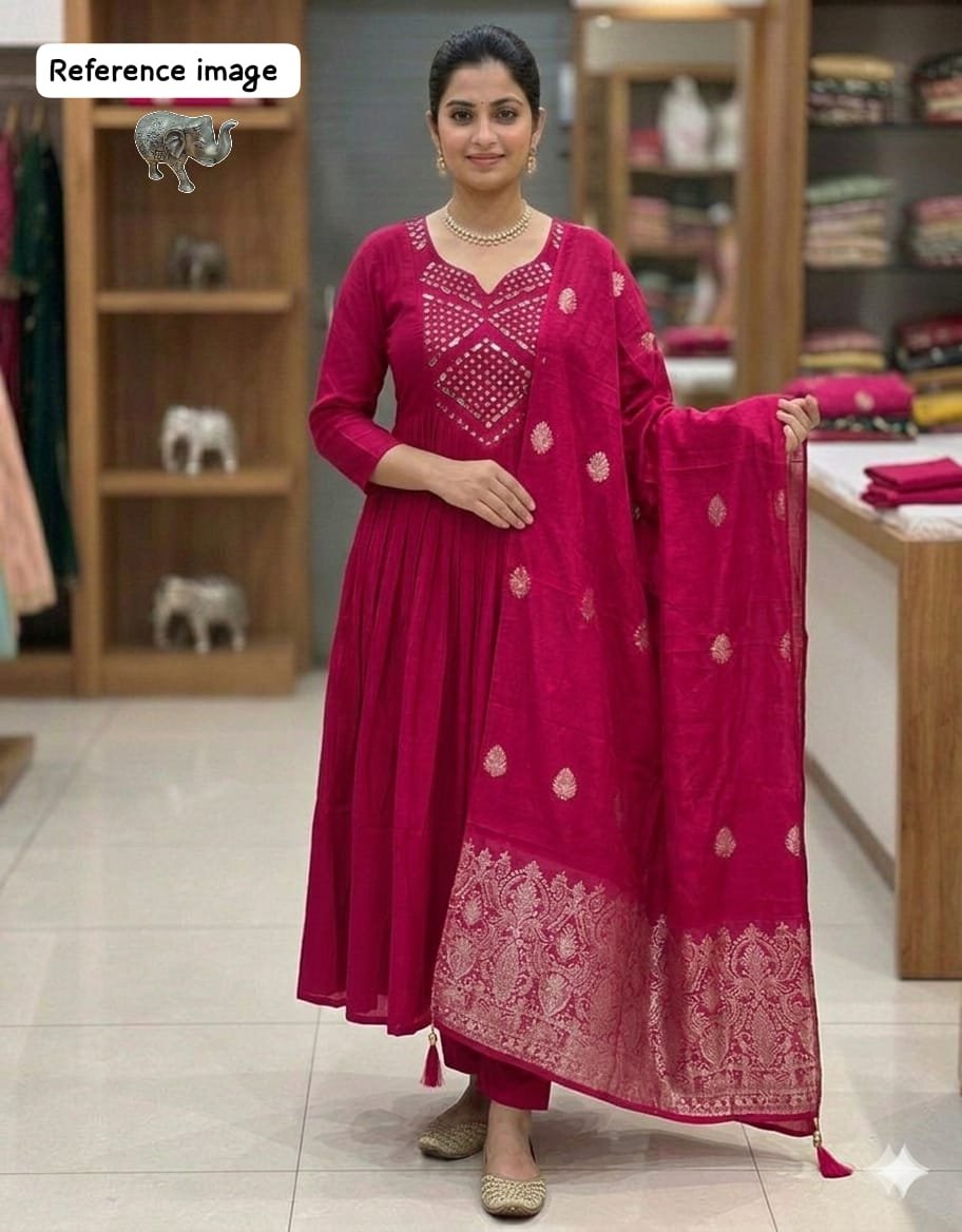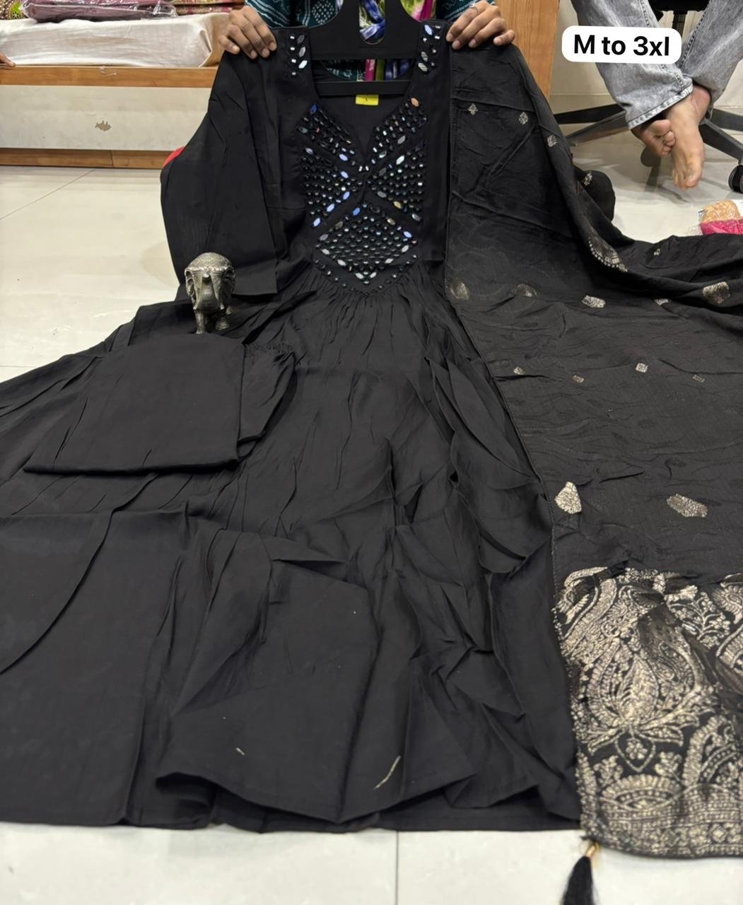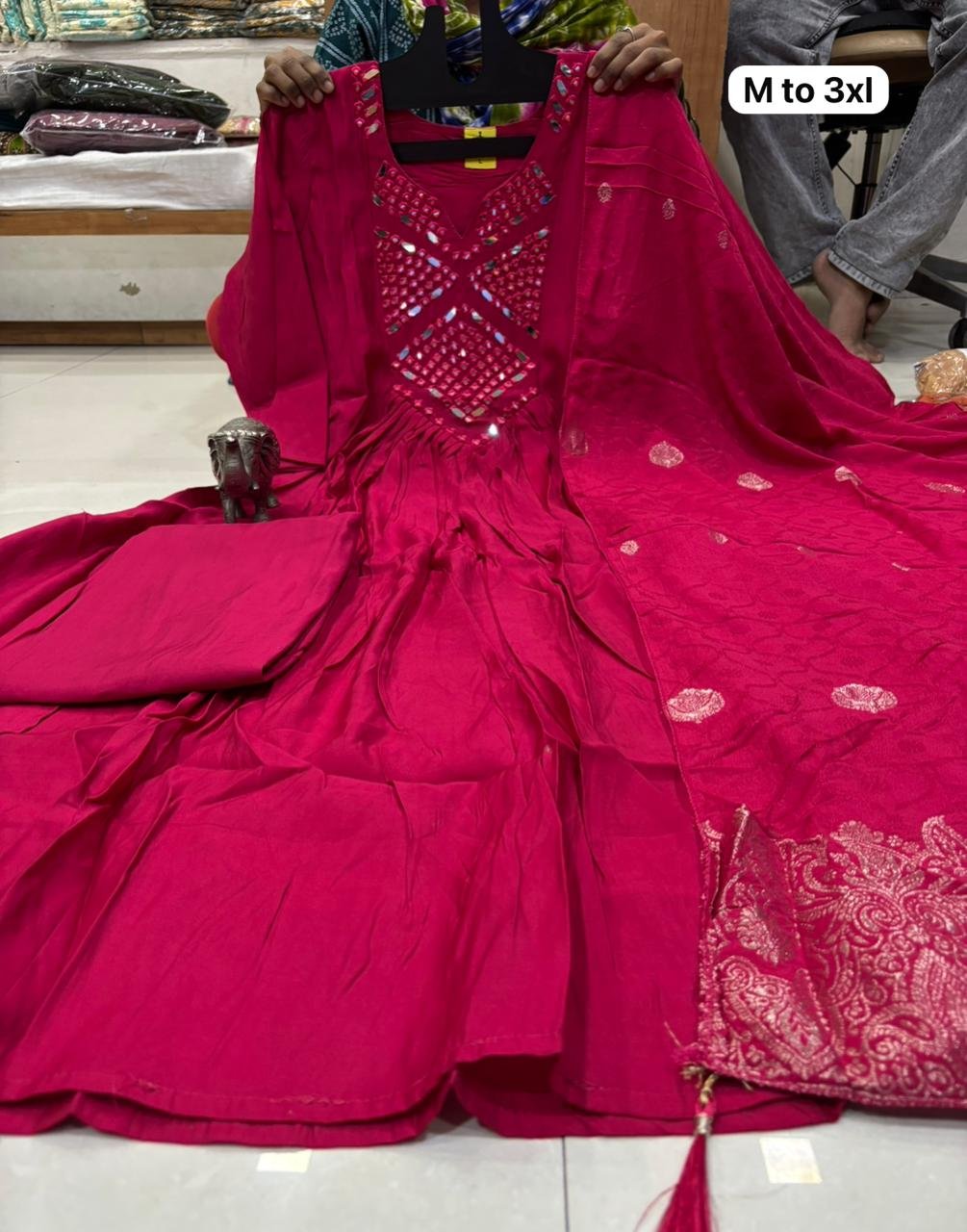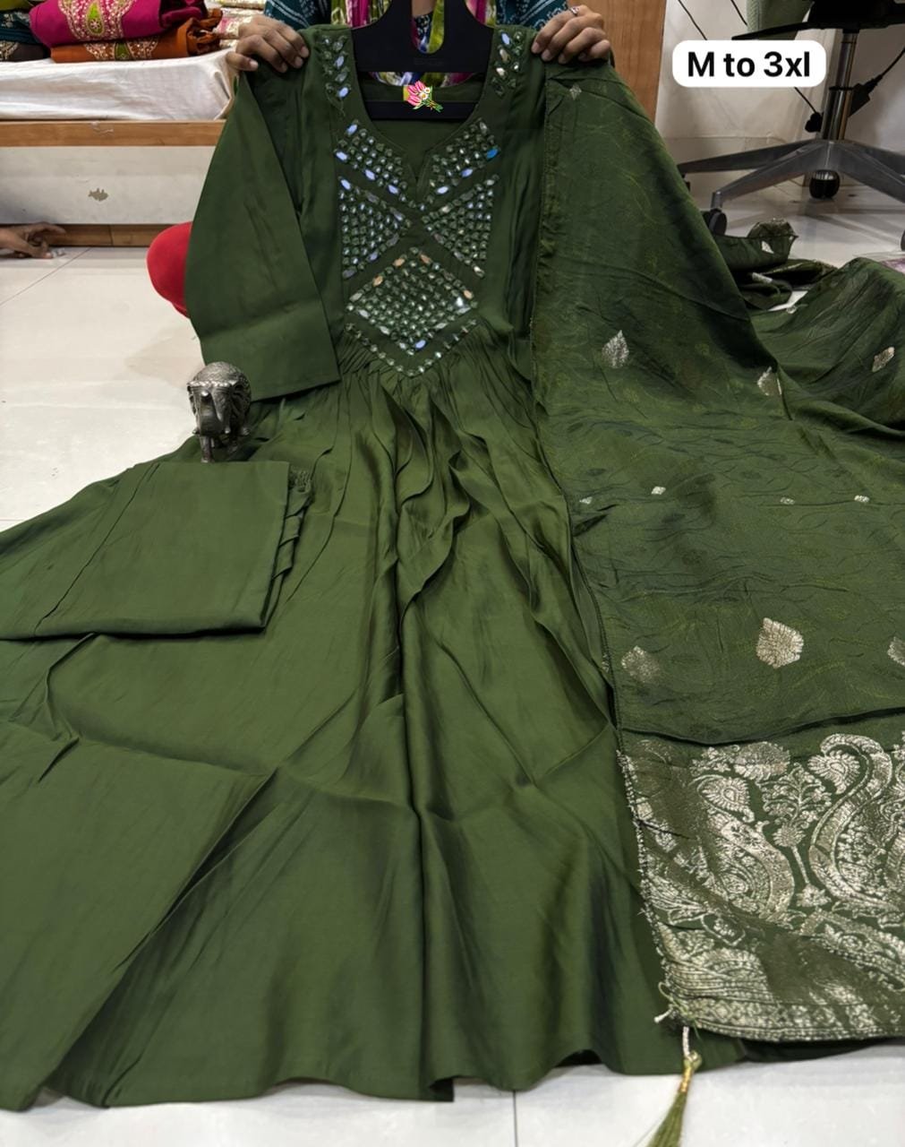 Elevate your wardrobe with our stunning Maslin Silk Mirror Hand Work Anarkali Kurti Set. This set includes a gorgeously hand-worked Anarkali Kurti, complementing Plazo pants, and a luxurious, beautifully adorned Dupatta. Designed to blend modern style with traditional charm, this outfit exudes elegance and sophistication.