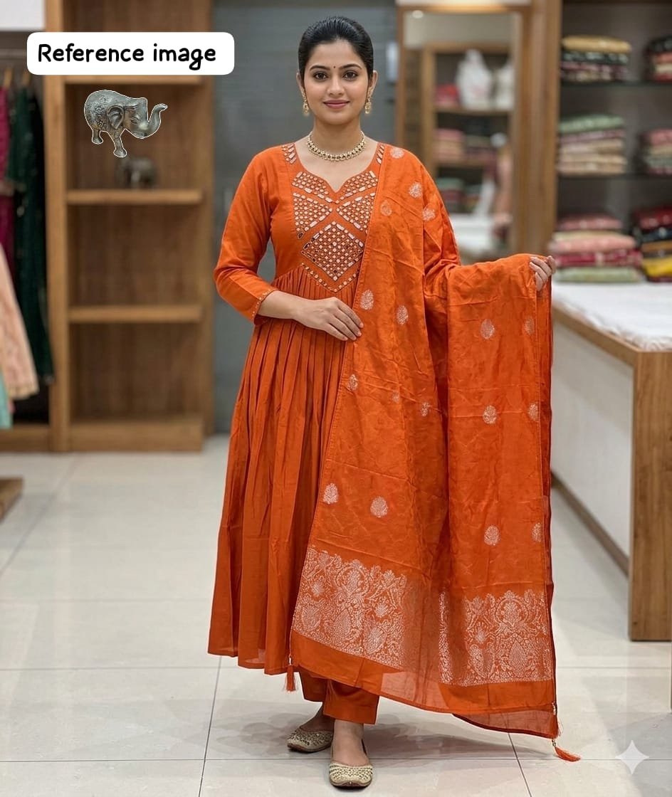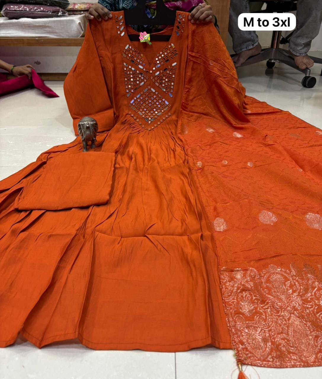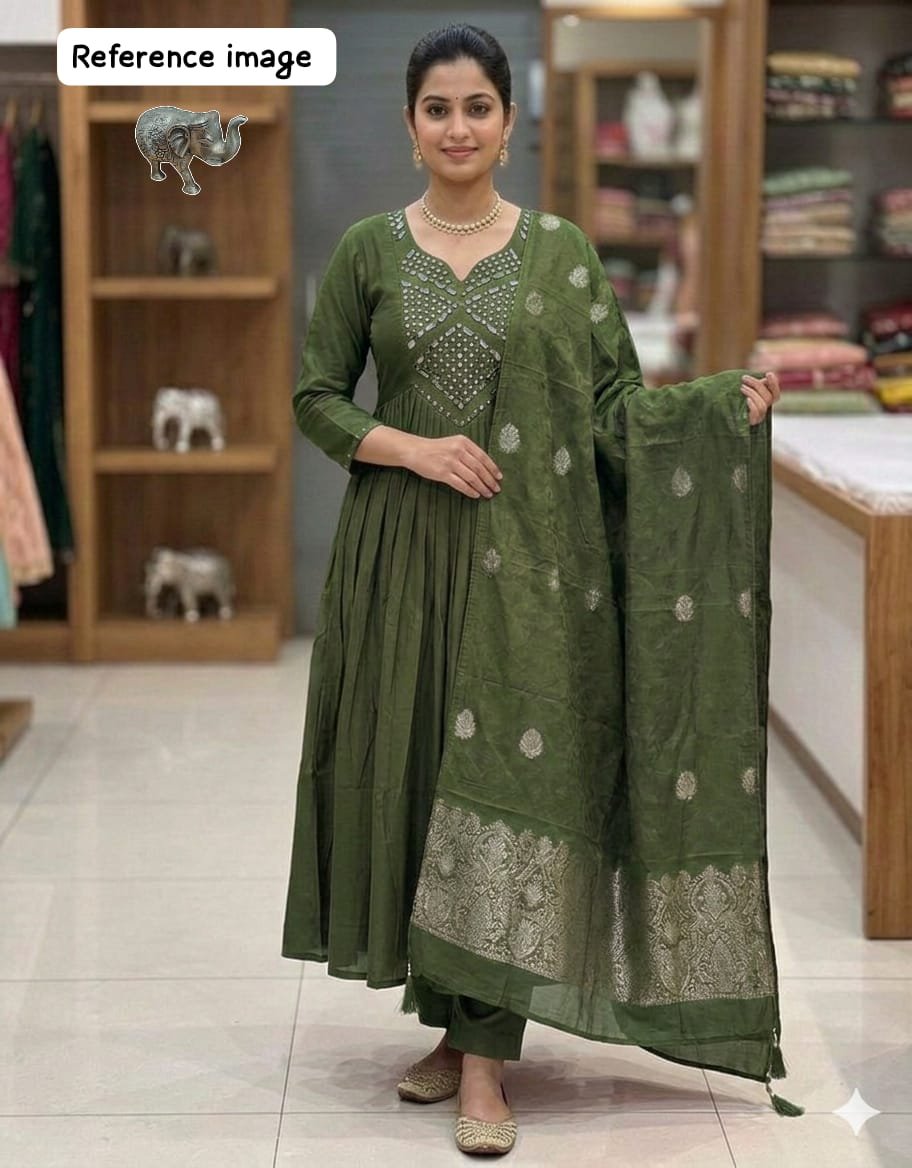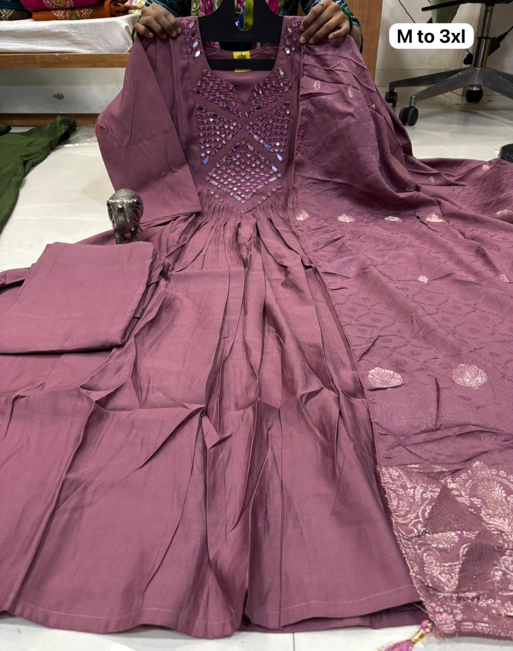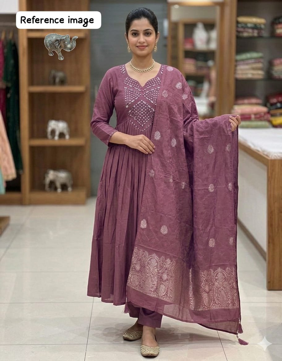 Elevate your wardrobe with our stunning Maslin Silk Mirror Hand Work Anarkali Kurti Set. This set includes a gorgeously hand-worked Anarkali Kurti, complementing Plazo pants, and a luxurious, beautifully adorned Dupatta. Designed to blend modern style with traditional charm, this outfit exudes elegance and sophistication.
