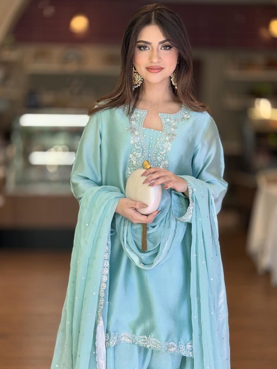 The matching plazzo is made from the same high-quality Roman Glass Silk fabric, featuring complementary embroidery with elastic for a perfect fit. With a classic Farshi Plazzo style and a length of 40-41 inches, it adds graceful flair to every movement. Fully stitched, it provides hassle-free wear without compromising on elegance.