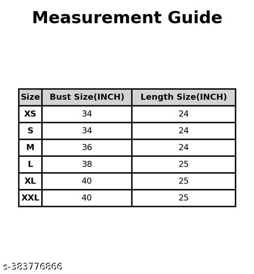 Sizes :  XS (Bust Size : 34 in, Length Size: 24 in) | S (Bust Size : 34 in, Length Size: 24 in) | M (Bust Size : 36 in, Length Size: 24 in) | L (Bust Size : 38 in, Length Size: 25 in) | XL (Bust Size : 40 in, Length Size: 25 in) | XXL (Bust Size : 40 in, Length Size: 25 in)