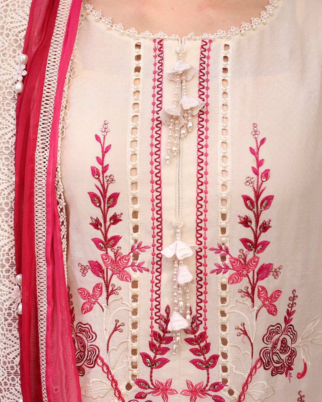 The addition of stick-on pearls elevates the overall design, creating a luxurious blend of tradition and contemporary style. These embellishments sit seamlessly on the fabric, adding an understated yet shining detail that enhances the aesthetic appeal of the panels. Whether paired with trousers, shalwars, or accessories, this product completes your outfit with sophistication.