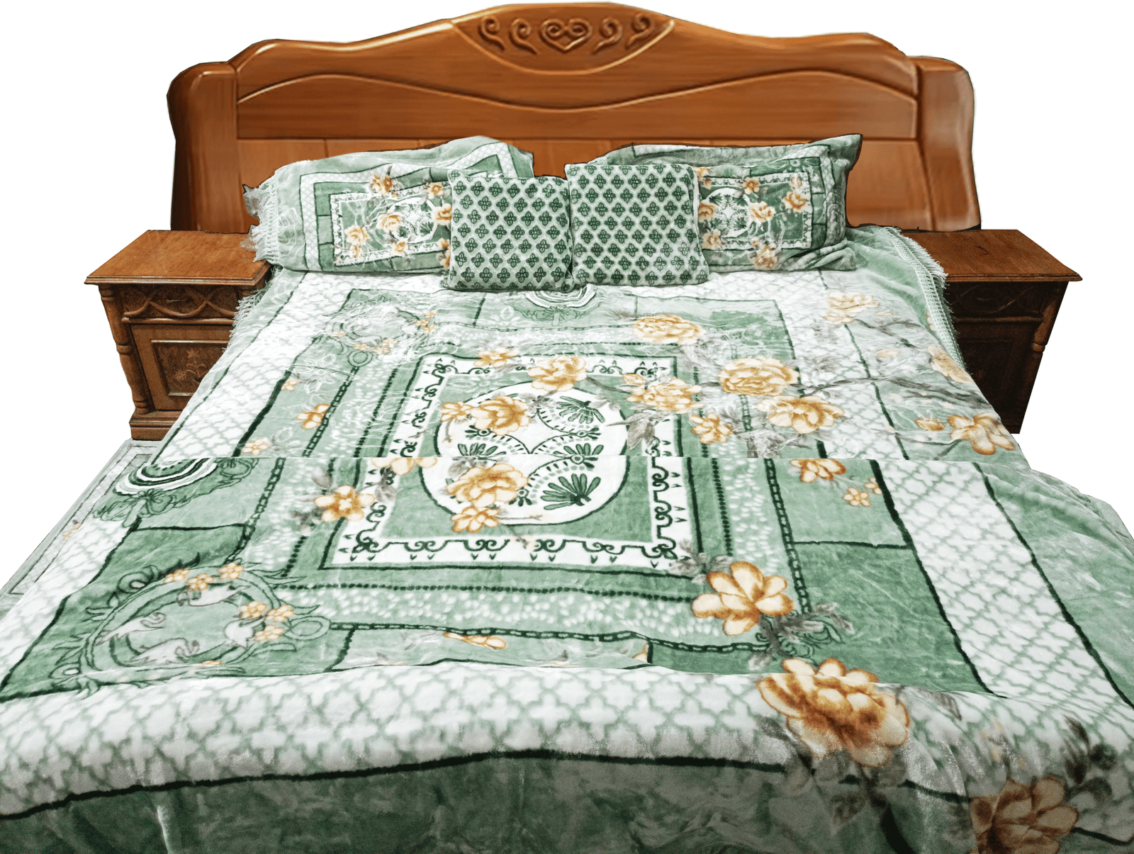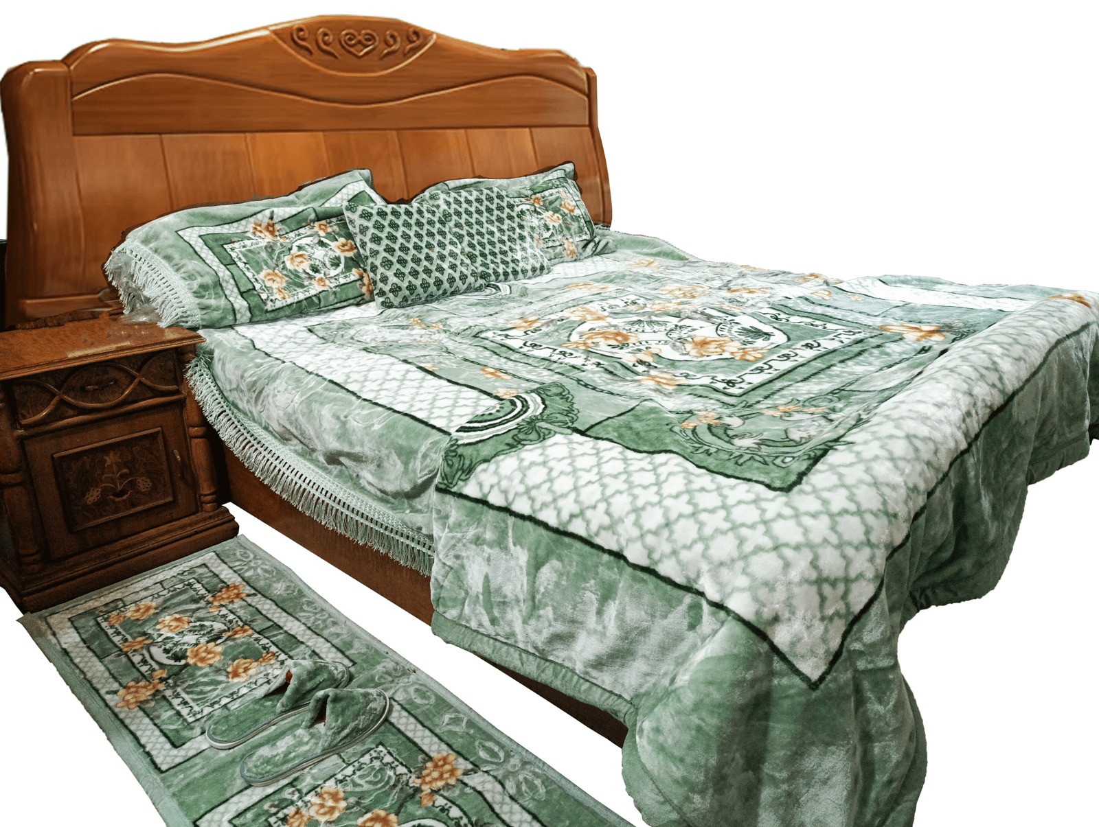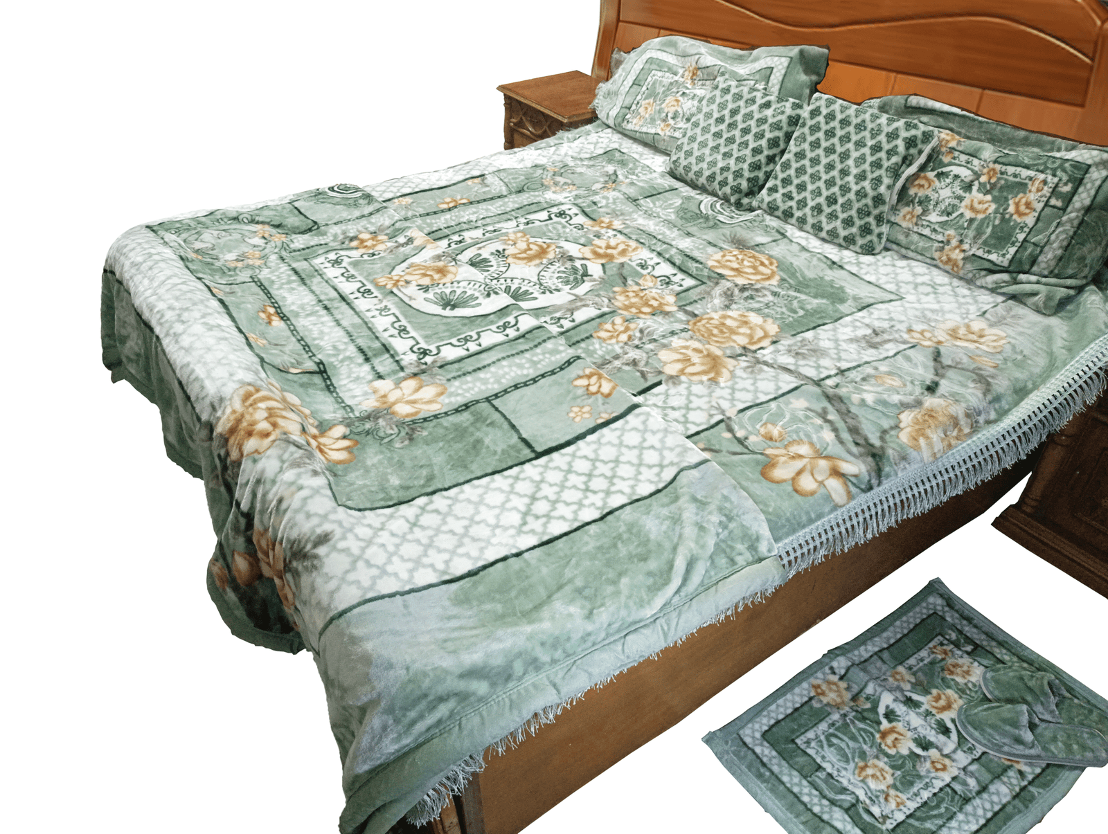 One Blanket | One Bedsheet | Two Pillow Covers | Two Cushion Covers | Two Pair Furry Slippers | One Long Mat | One Short Mat